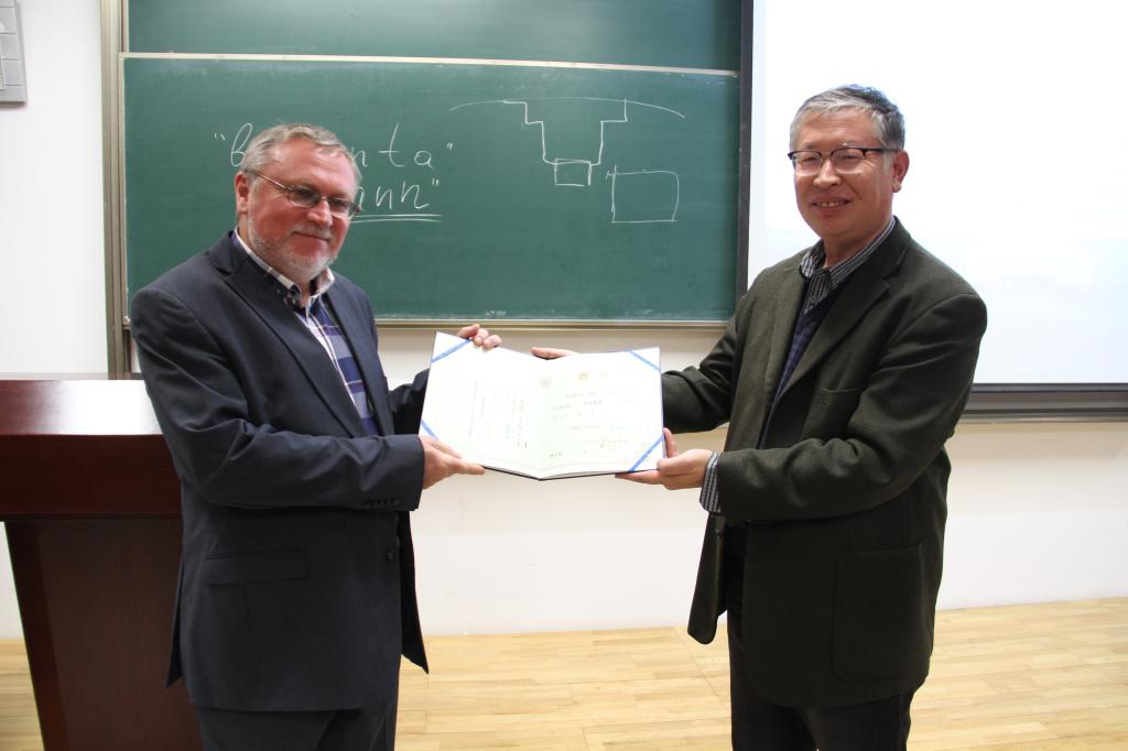 2016年10月14日下午,太阳集团在南校区举行聘任仪式,聘请尼古拉.尼古拉维奇.卡拉丁(NikolayNikolaevichKradin)教授为太阳集团客座教授,太阳成集团tyc234cc院长那顺巴依尔教授为尼古拉.尼古拉维奇.卡拉丁(NikolayNikolaevichKradin)教授颁发了证书。