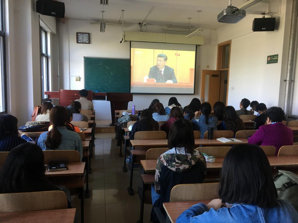 我院组织师生在综合楼306教室观看此次大会盛况。结束后,学院党总支书记与团员青年讨论了习近平总书记重要讲话精神。