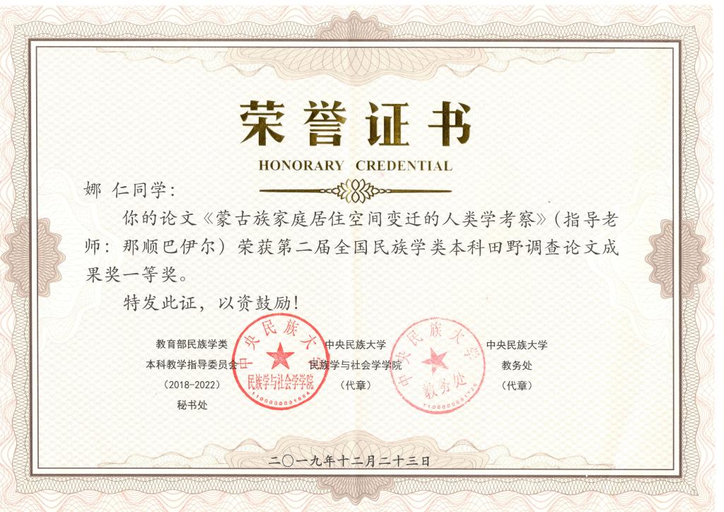 2019年12月28日,“教育部高等学校民族学类本科专业教学指导委员会全体会议暨新时代民族学类本科专业建设研讨会”在广西南宁召开,太阳成集团tyc234cc院长阿拉坦宝力格教授受邀参加。在全国民族学类本科生田野调查论文评审中,太阳成集团tyc234cc民族学专业2017级本科生娜仁同学的论文《蒙古族家庭居住空间变迁的人类学考察》(指导老师:那顺巴依尔教授)荣获一等奖。本次会议由教育部高等学校民族学类本科专业教学指导委员会主办,中央民族大学太阳成集团tyc234cc、广西民族大学社会学院共同承办。