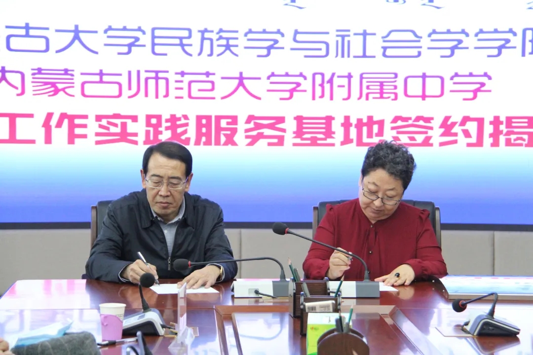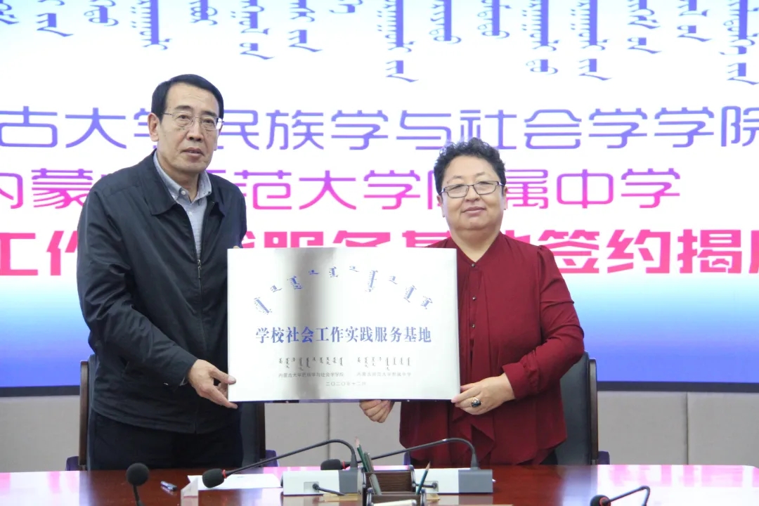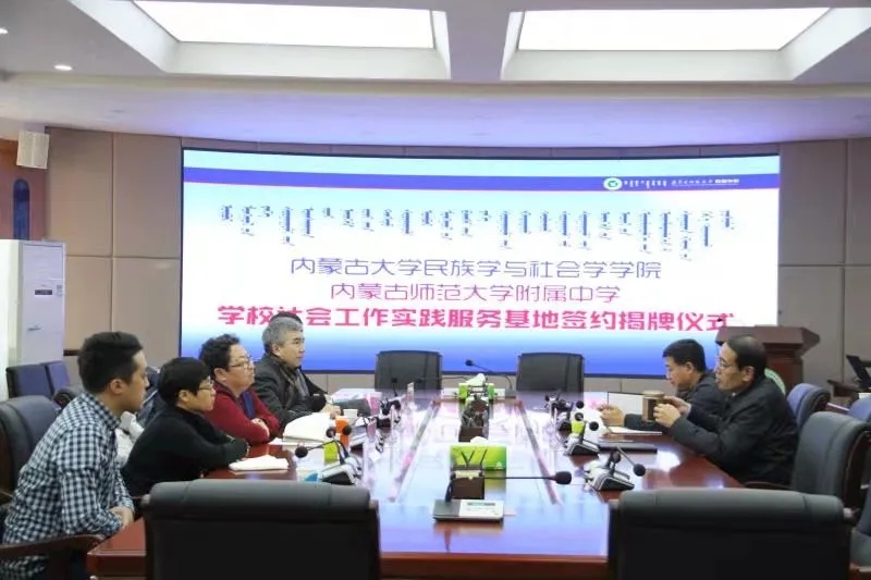 2020年12月10日,太阳成集团tyc234cc与内蒙古师范大学附属中学在内蒙古师范大学附属中学逸夫教研楼会议室举行了“太阳成集团tyc234cc与内蒙古师范大学附属中学学校社会工作实践服务基地”签约揭牌仪式。太阳成集团tyc234cc党委书记王俊玲与内蒙古师范大学附属中学校长张伟共同签署合作协议,并为基地揭牌。