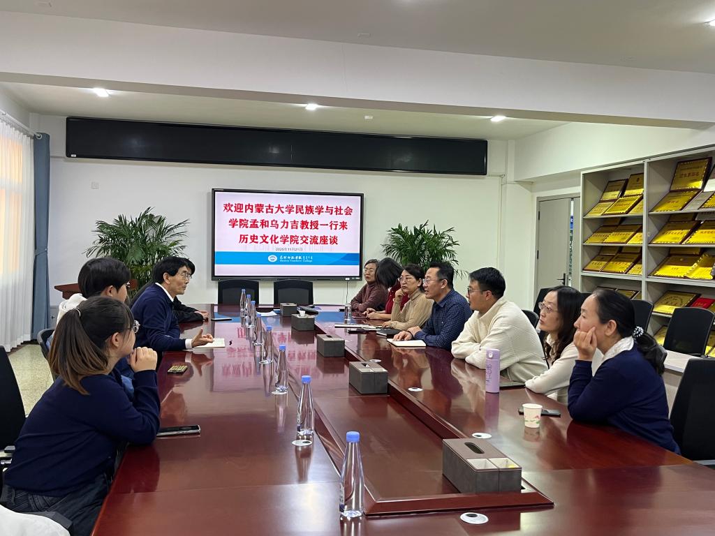 之后,孟和乌力吉教授继续走访了包头师范学院政法学院和历史文化学院,围绕本科课程建设、教研室建设、实践教学和阴山文化研究等多个议题进行交流座谈。座谈会上,政法学院院长高德胜、副院长魏成及师生代表与内大民社院团队围绕社会工作专业建设与实践教学开展深入交流。魏成副院长重点介绍了学院“课程实践+三习”相结合的实践教学模式,以及在校地共建“实践教学联合共同体”方面的探索经验。学院近年来在“互联网+”“挑战杯”等学生竞赛中取得突破,展现了实践育人成效。交流中,孟和乌力吉建议加强师生交流、课程共享、学生互访,合作共建“昆都仑河环境与社会研究工作坊”,聚焦北疆地区的社会学与社会工作专业发展议题,实现资源整合与优势互补。