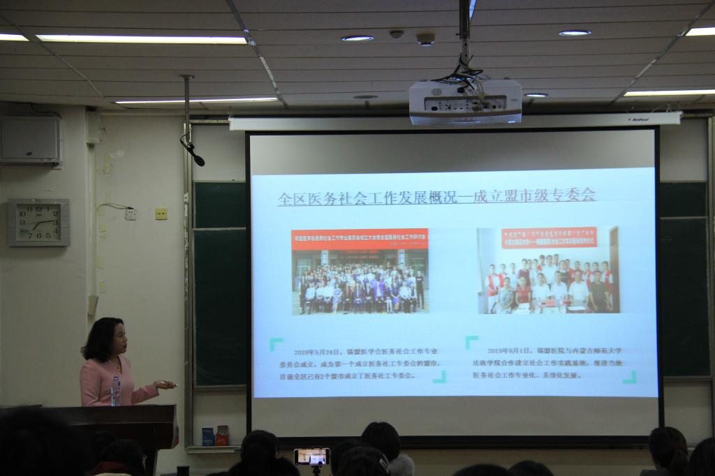 2020年12月9日晚,内蒙古自治区人民医院医务社工部主任陆俪平受邀来我院为社会工作学系的师生做了一场题为《“双工联动”模式下的内蒙古自治区医务社会工作发展》的讲座。讲座由社会工作学系主任孙丽敏老师主持。出席本次讲座的有社会工作学系的赵美荣老师、内蒙古自治区人民医院医务社工部的全体工作人员。讲座在太阳集团北校区卓越楼阶梯教室2举行。