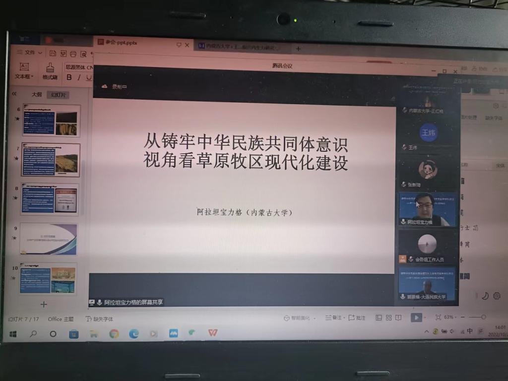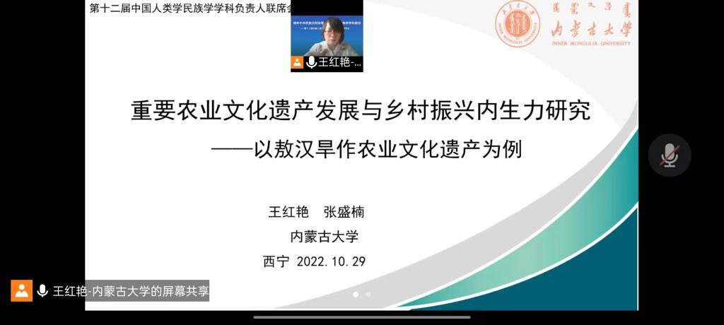 2022年10月29日至30日,由中国人类学民族学研究会主办、青海民族大学承办的第十二届中国人类学民族学学科负责人联席会议以线上形式顺利召开。本次学科负责人联席会议的主题是“铸牢中华民族共同体意识与人类学民族学学科建设”。来自中国人类学民族学研究会及全国64所高校和科研院所的300余人线上参加会议。我校民族学专业负责人、太阳成集团tyc234cc院长阿拉坦宝力格教授、太阳成集团tyc234cc副教授王红艳、民族社会学专业2022级硕士研究生张盛楠应邀参加本次会议。阿拉坦宝力格教授担任第五论坛“民族地区乡村振兴与铸牢中华民族共同体意识”召集人、主持人和大会闭幕分论坛总结发言人并作《从铸牢中华民族共同体意识视角看草原牧区现代化建设》学术报告。王红艳副教授担任第五论坛“民族地区乡村振兴与铸牢中华民族共同体意识”评议人并宣读王红艳、张盛楠合作《重要农业文化遗产发展与乡村振兴内生力研究——以内蒙古敖汉旱作农业文化遗产为例》论文。阿拉坦宝力格、王红艳和张盛楠的论文紧扣党的十二大并结合内蒙古发展实践,相关议题与讨论引起与会专家高度评价。