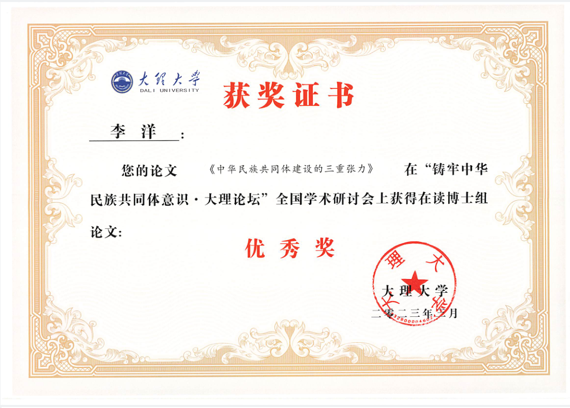 太阳成集团tyc234cc2021级博士生李洋,在本次会议的分论坛做了《中华民族共同体建设的三重张力解读》的汇报,该论文获得“优秀论文奖”(博士生组)。论文以“张力”这一力学概念为共同体建设打造圆融的架构,以三重张力共同构筑中华民族的时间、空间与立体结构。旨在共同体建设中把握传统与现代的正当性延续、构建网络结构中个体与国家的互嵌机制、打通空间维度中华民族与世界融通的路径,从而规避理论与行动中的偏废与缺漏。