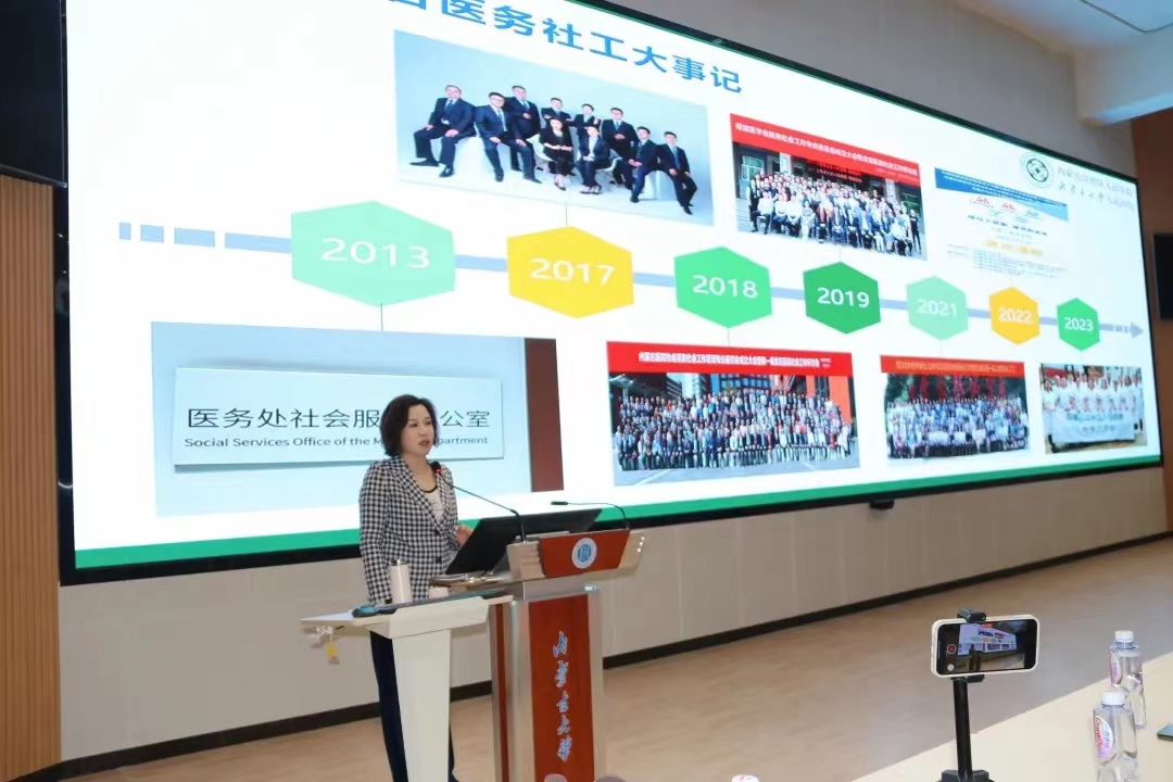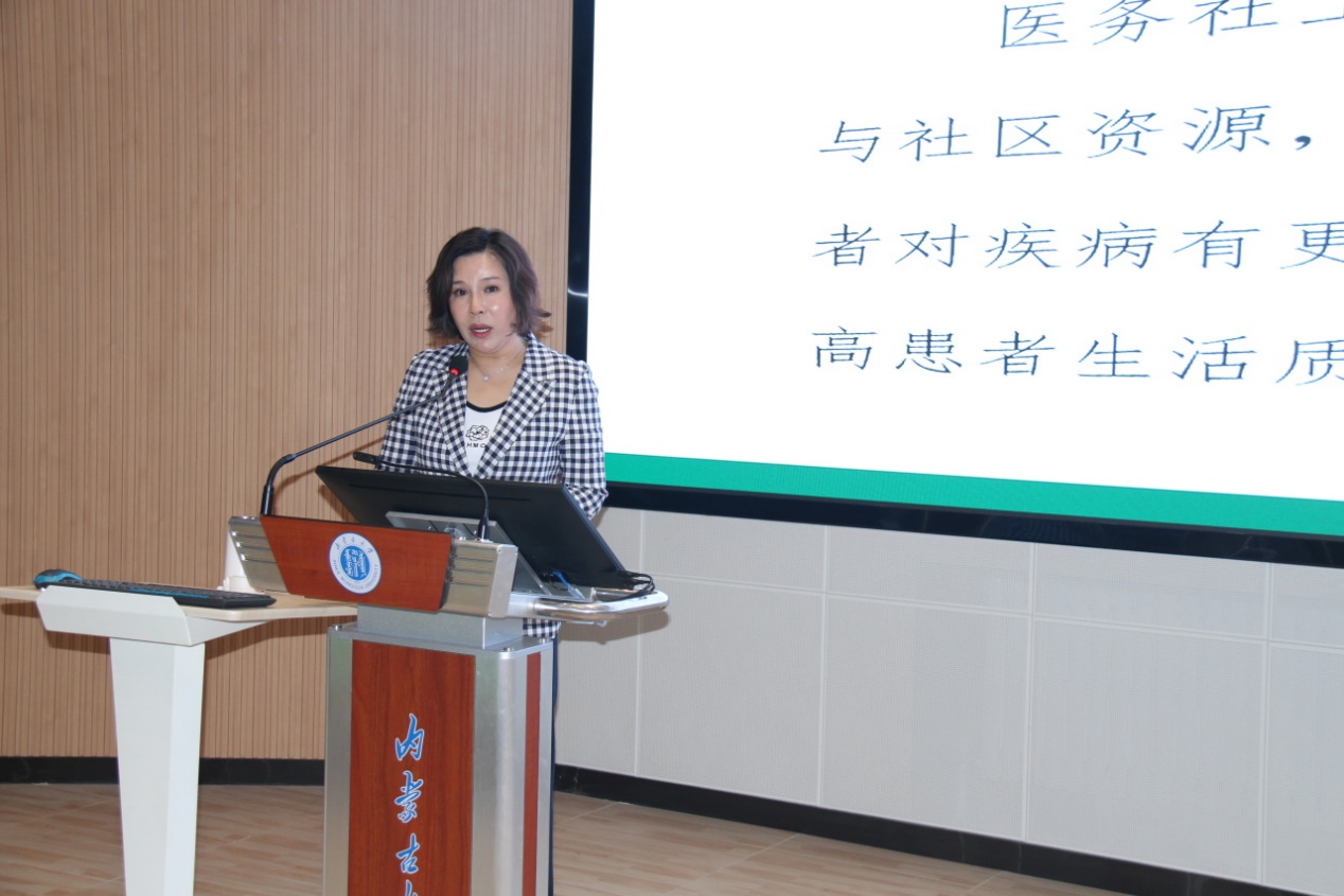 陆俪平主任首先对医务社会工作发展进行了回顾,然后从“国家政策引领”、“地方政策引领”、“全国义务社会工作人才队伍”、“现阶段国内医务社工配置模式”等方面对我国医务社会工作的起源和发展,以及医务社会工作本身进行了充分介绍,最后将视角聚焦本地,讲述了自2013年内蒙古自治区人民医院医务处社会服务办公室成立以来,内蒙古地区医务社会工作蓬勃向上的发展历程。