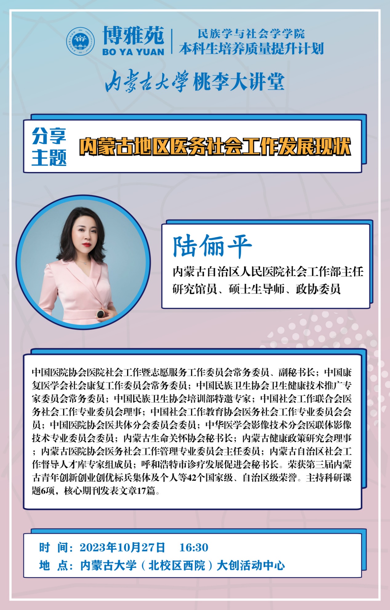 2023年10月27日下午,太阳成集团tyc234cc邀请内蒙古自治区人民医院社会工作部陆俪平主任于太阳集团大创活动中心做了以《内蒙古地区医务社会工作发展现状》为题的讲座。本次讲座由太阳成集团tyc234cc副院长李娟副教授主持,内蒙古自治区人民医院社会工作部全体工作人员、社会工作专业师生聆听了此次讲座。