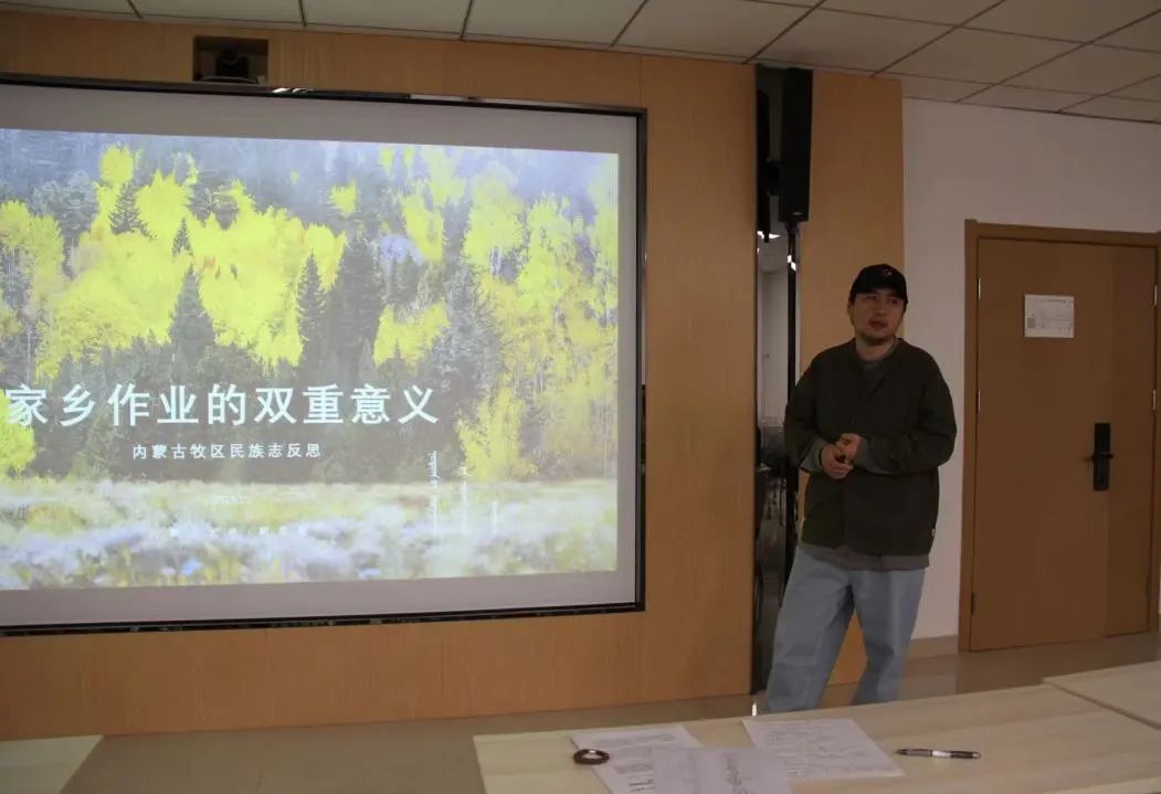 朝克赛老师讲解人类田野调查的特点。及讲解田野工作原型形象与“纯正阶序”,他强调“田野”和“家乡”的彻底分离,“田野”与“家乡”之间的差异导致田野地点的“纯正阶序”,越是“非家乡”的地方就越适合做田野也更“像田野点”。又讲到随着人类学家对田野工作原型形象的反思得出一个新的概念—家乡作业。家乡作业研究自己的社区或身份,且成为了人类学家们为了应对传统田野作业叙事能力不足而探索的一种新途径。同时朝克赛老师还结合自身田野调查的经历,为同学们讲述了“田野点与我家乡的近似性”“我的田野点价值”的内容。