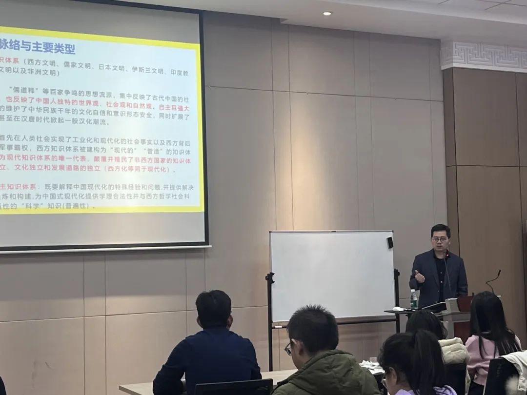 我院“土而根河”讲座继续进行。2023年11月25日上午,中国社会科学院杨典研究员受邀在我校逸夫楼217为我院师生做主题为“中国式现代化与中国自主的知识体系建设——基于知识社会学的分析”的学术讲座,讲座主要围绕自主知识体系对国家安全和经济社会发展道路的重要性、知识体系的意识形态性、构建中国自主知识体系的时间表和路线图等方面的议题进行了详细深入的讲解。本次讲座由宋跃飞副院长主持。