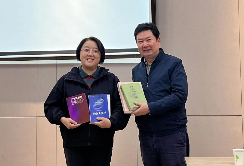 讲座开始前,施琳老师赠与我院《广义民族学导论》《经济人类学》《施正一文集》等本人及施正一先生的著作,阿拉坦宝力格院长代表我院回赠施琳老师荣誉证书。